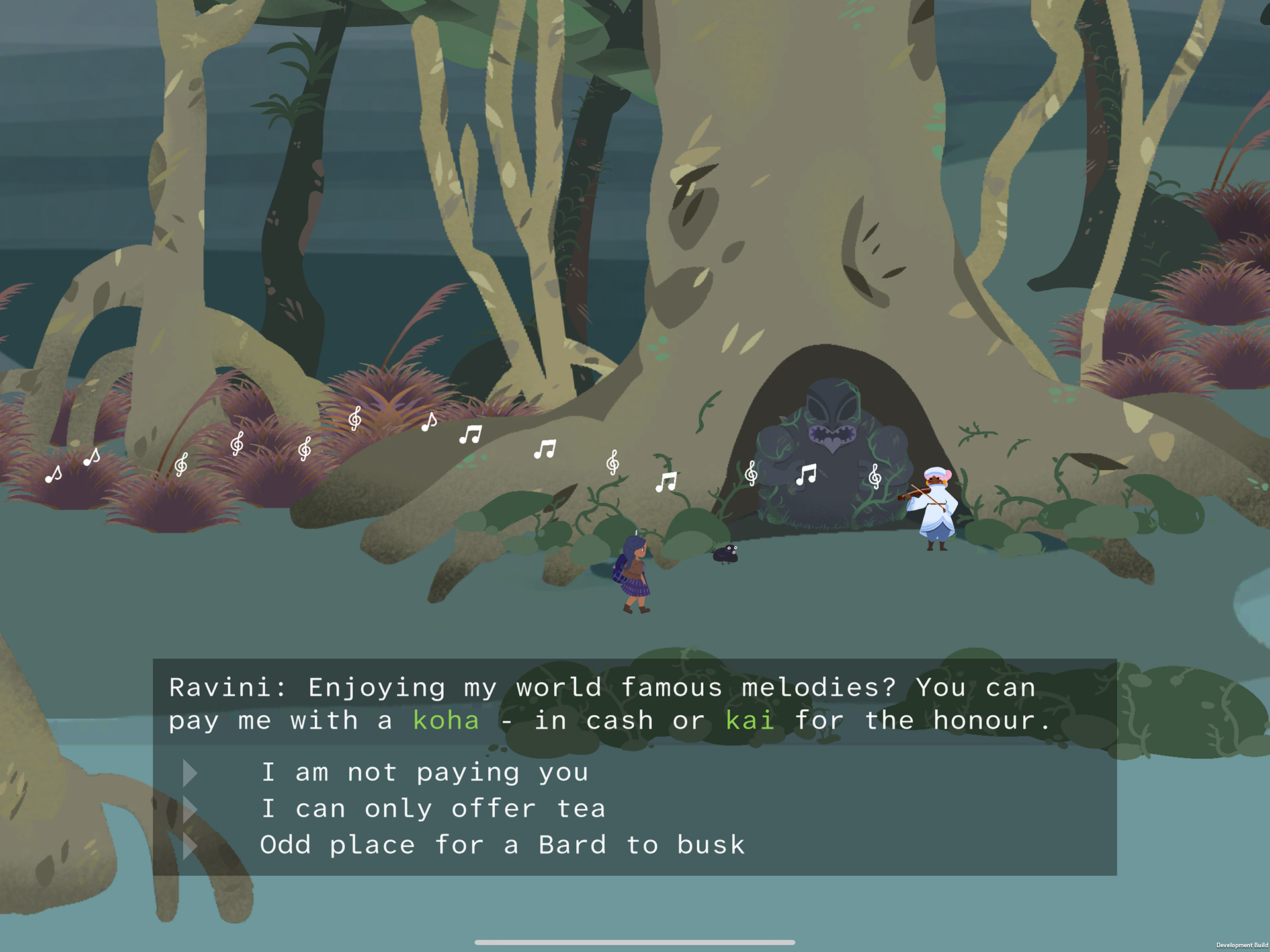 Along her travels, Hine meets Ravini, a sea trader and bard who has come to this land searching for the famous red Mountain cloth woven by the local monks. While playing a song to an old shrine, they unlock Hine's powers to see the spirit world.